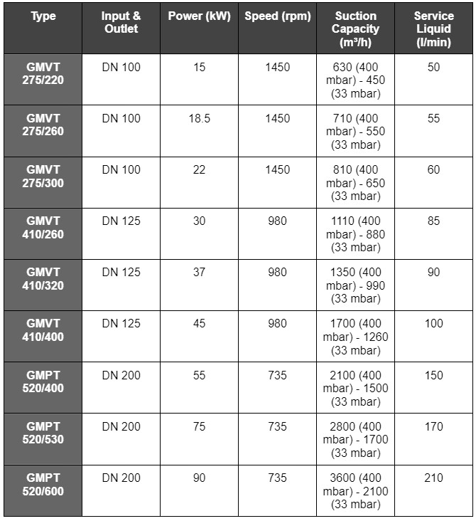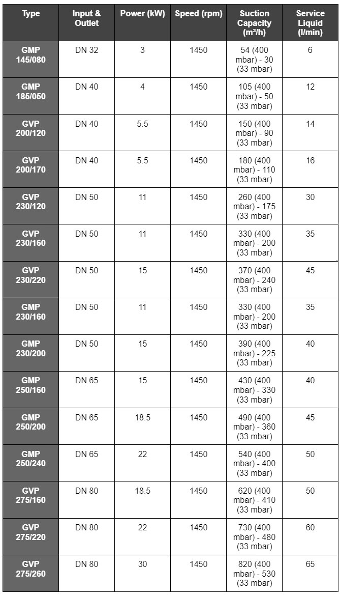 - Suction Capacity (m³/h): The volume of gas that can be evacuated by the pump per hour, measured at different absolute pressures (from 400 mbar to 33 mbar).